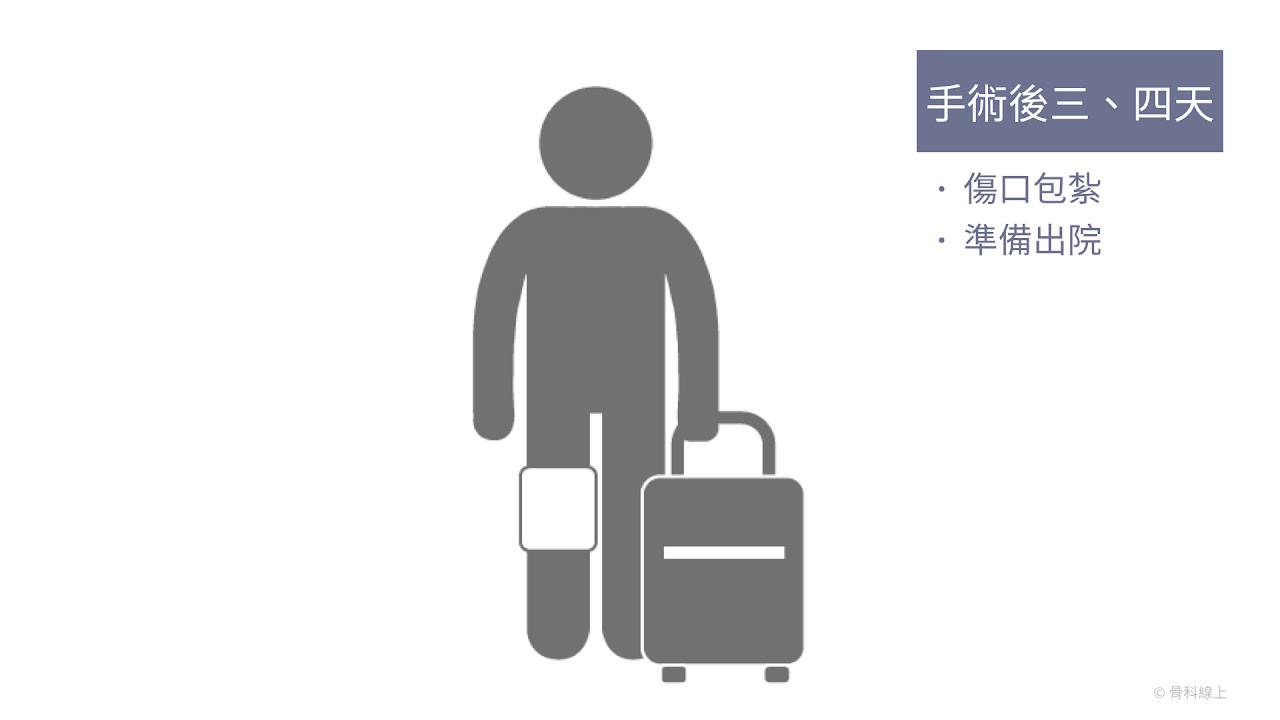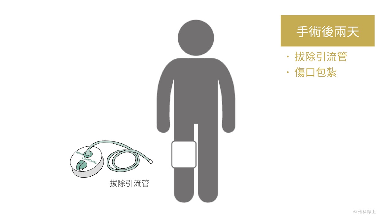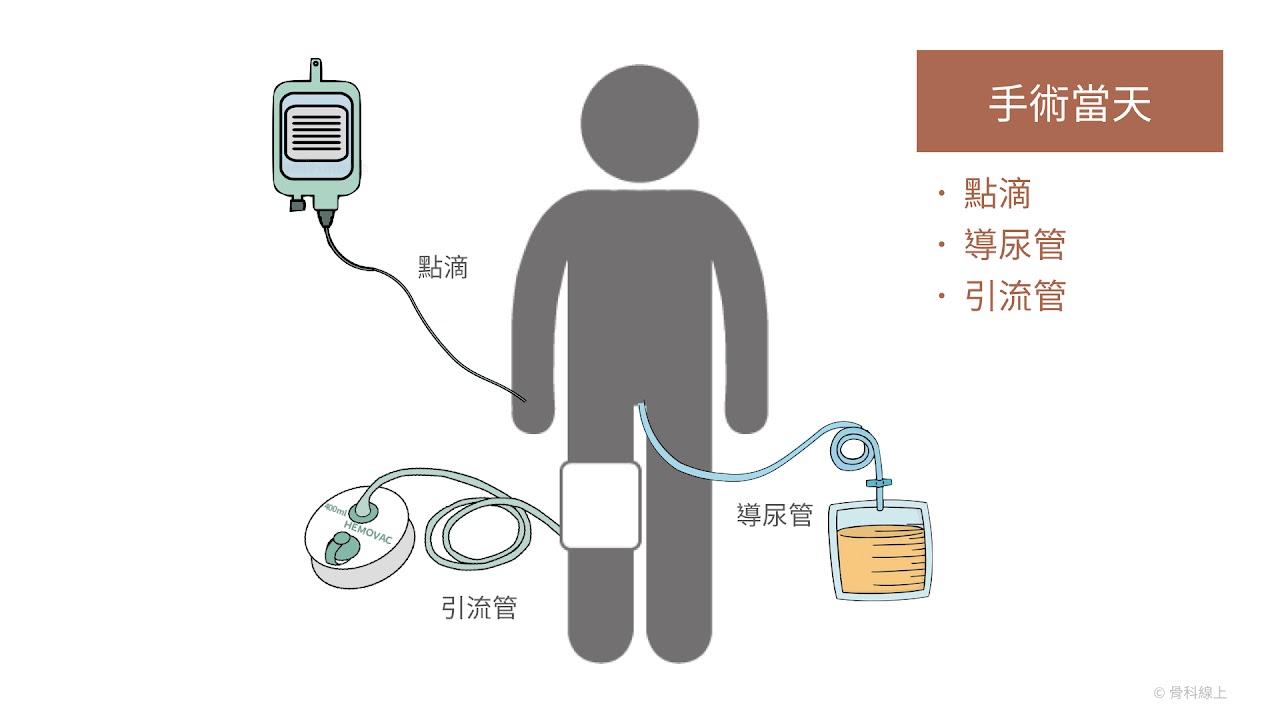 手術後隔天移除點滴以及尿管,引流管繼續放置。更重要的,要開始手術後早期下床以及各項復健功課。