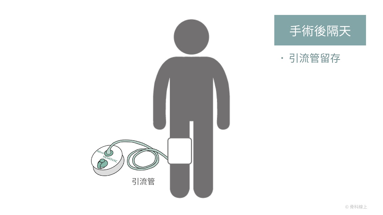 放置引流管可以減少傷口滲血、周遭廣泛瘀血以及關節內血腫所帶來的不適感,一般而言,於手術後兩天移除,多數的出血可藉由引流管排出,剩餘的關節內出血可等待其自行吸收。